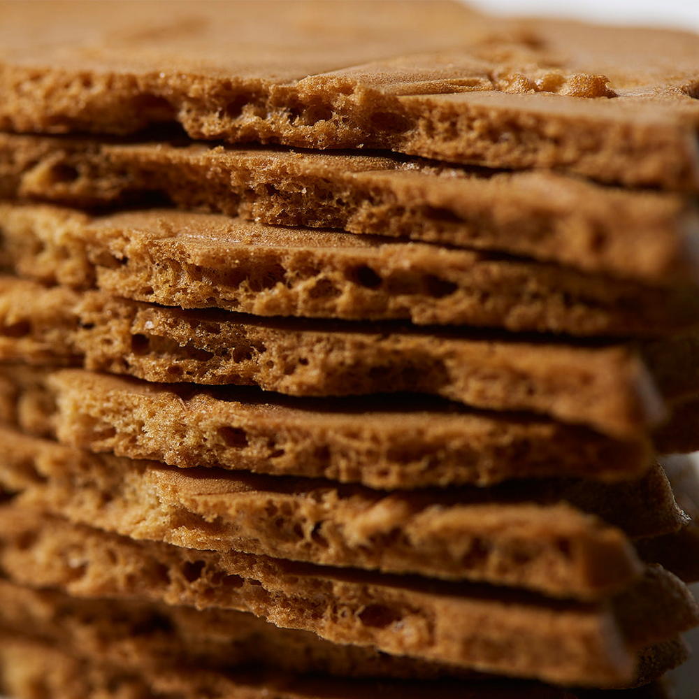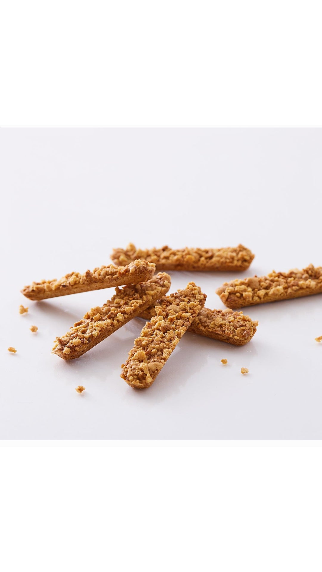 講究製法,逐片細心製作的薄脆餅乾,經過充分靜置後烘烤,口感細膩酥脆。口味有杏仁、巧克力、夏威夷豆、芝麻。Snacks & Cookies -